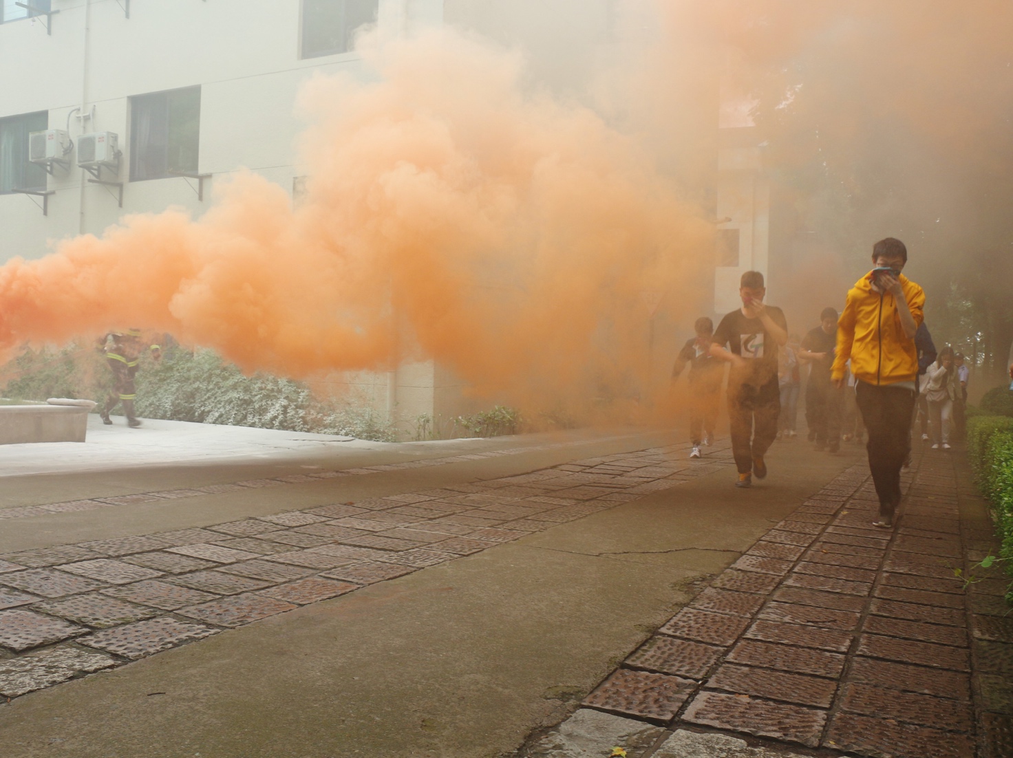 演习前15分钟,各单位进入演习指定地点并开始相关准备,保卫办还精心准备制作了消防安装展板置于食堂门口,以便同学们在演习开始前可以学习到相关消防逃生知识。12点30分,本次演习总指挥,校区管委会柴红副书记宣布演习开始。橙色烟雾从三栋宿舍楼下涌出,火警信号响起,全体进入警戒状态。宿管工作人员立即切断电源并打开门禁,启动消控广播,同时马上向校区保卫办报告火警。校区保卫办接到火警电话后,第一时间启动应急预案,通知校区志愿消防队立即赶到现场,同时立即将情况报告相关领导和有关部门。学校志愿消防队接警后身着专业消防服火速赶往现场,分工有序进行消防工作,部分队员进入宿舍楼进行救援,其余队员铺设水带、打开消防栓,迅速出水灭火,同时现场拉起了警戒带。宿舍同学迅速打湿毛巾捂住口鼻,在引导员的带领和消防队员的保护下,低姿快速撤离宿舍,并于11号楼前停车场处集合,在三分钟内宿舍全体同学均安全撤离火灾现场。