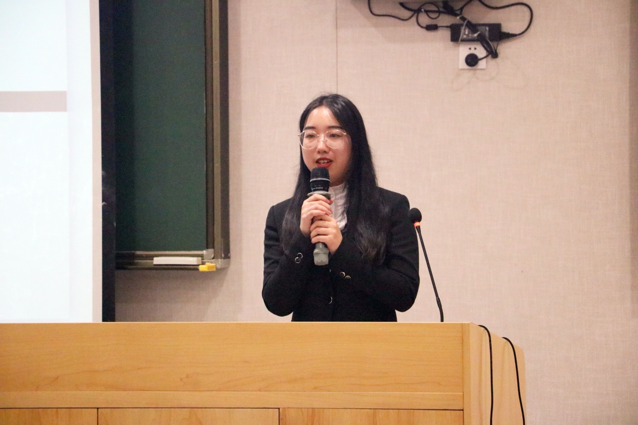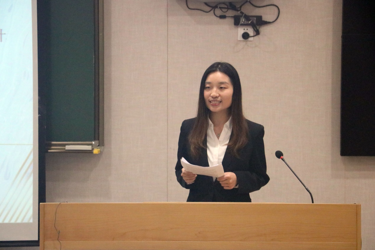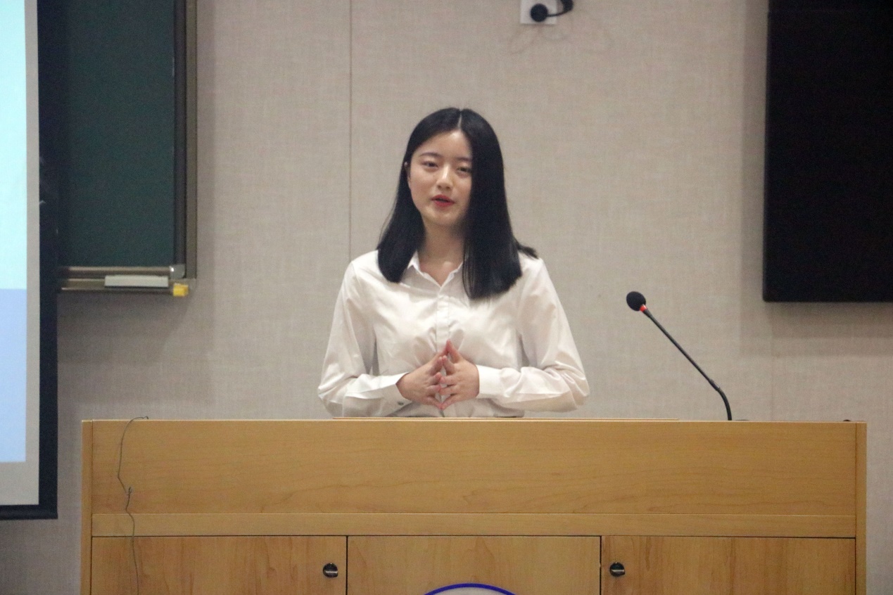 首先出场的是来自本科16级的1号选手吴梦婕,她从自己的教育背景、学术研究、实习经历和技能特长4个方面全方位介绍了自己,并以良好的表现博得在场5位嘉宾的爆灯。