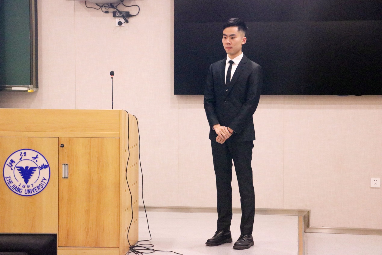 而8号选手来自18级科硕的包雍彬同学则从自己的基本情况、实习经历、所获奖项以及职业规划四个方面进行的谦逊的自我介绍,并着重的阐述了自己想留在杭州做诉讼业务的未来向往,获得全场5盏爆灯。