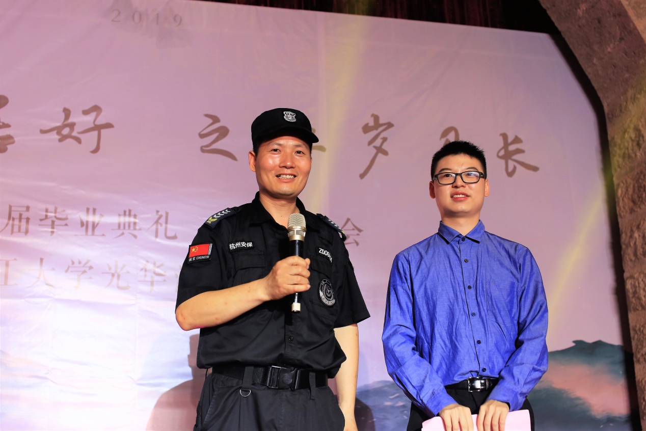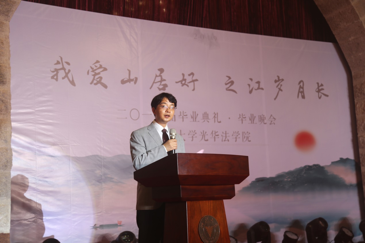 典礼在光华法学院副院长赵骏教授主持下有序进行。出席本次典礼的有优秀校友代表刘胤宏律师;光华法学院常务副院长周江洪教授、副院长郑春燕教授;章剑生教授、叶良芳教授、陆青副教授,毕业班班主任、德育导师代表王晖副教授;团委副书记王书剑、骆笑老师,研究生党总支副书记柴烈老师,以及之江校区保卫办、之江校区食堂、宿管办、医务室等各线老师。