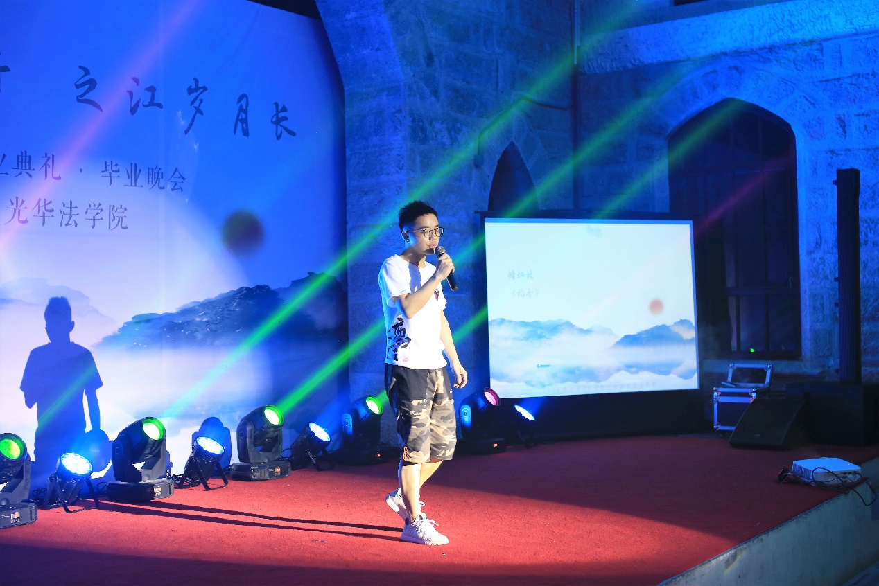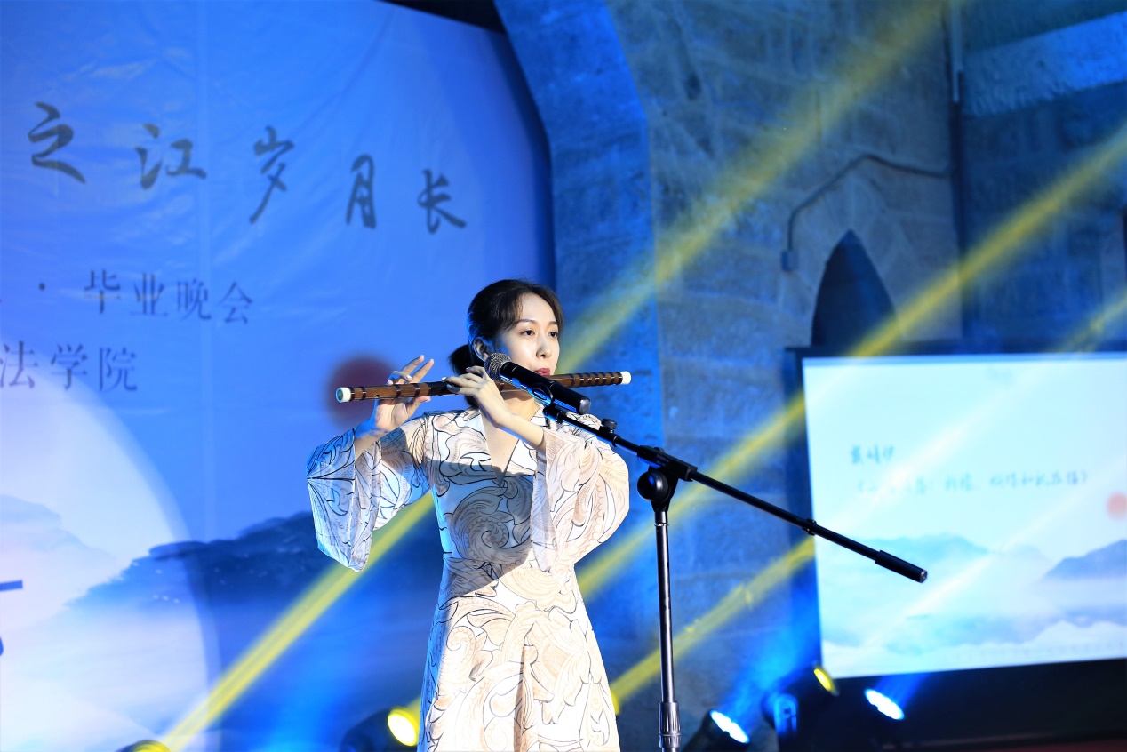 毕业晚会在史庭来、张琼珲、王朝睿、余佩樨四位主持人的主持下徐徐展开。晚会伊始,15级本科生戴婧伊吹奏的歌曲串烧《山居随想——柠檬、蝴蝶和机器猫》点燃了现场的氛围,大家沉浸其中,随着节奏晃动身体。15级本科生迪丽尼哈丽·艾尔肯、娜扎开提·亚力坤伴着歌曲《掀起你的盖头来》带来激情洋溢的新疆民族舞表演,曼妙的舞姿令席间掌声不绝。17级法硕张镇麒酣畅淋漓的武术表演《轮回》让大家应接不暇,连声叫好。而一曲《稻香》在16级法律硕士储灿林演绎下清新而又温馨。
