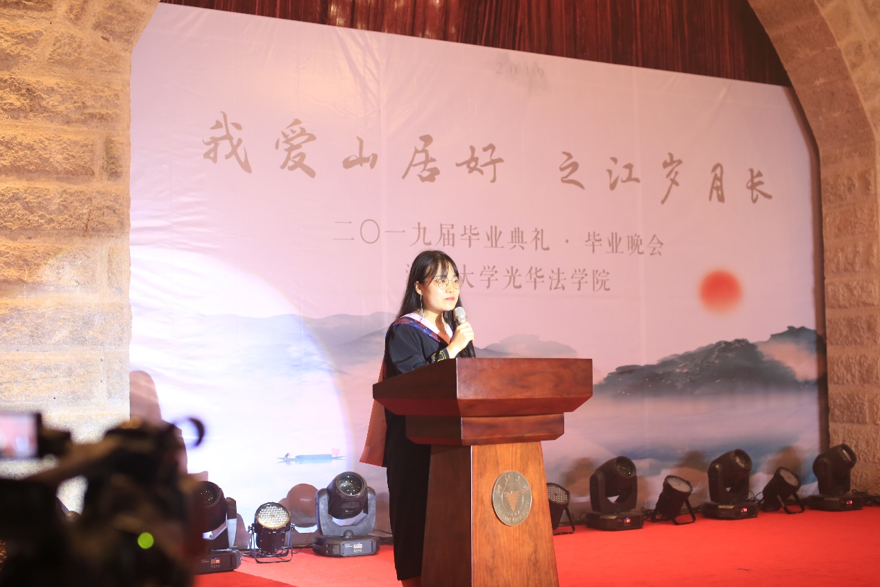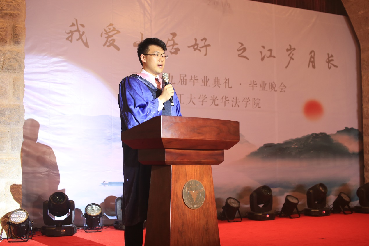 赵时康作为硕士毕业生代表发言,他即将入职浙江省商务厅。他在发言中说到,我们的院训“求是厚德,明法致公”就是回答竺校长最好的答案,这八个字引导着法学学子为人处世,干好工作。并代表硕士生承诺不论今后奔往何方,都应以德为先,实事求是,将自己的工作专业做精做实。