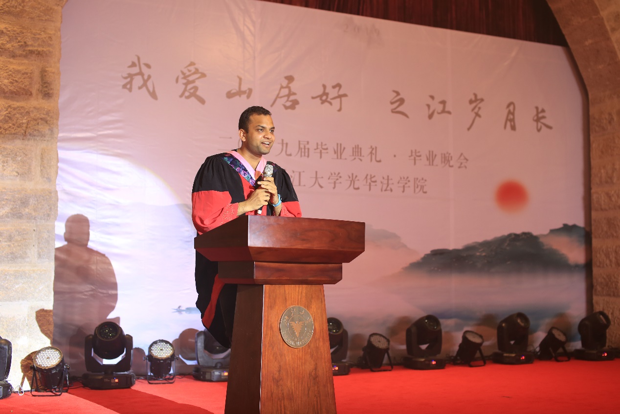 Vinay Sharma作为留学生代表发言,他非常感激浙大的丰富多彩的学习生活。在学习中,他养成了更为科学的学习习惯,培养了清晰的思维,提升了学习的积极性。此外,他参加了龙舟比赛和法学院的羽毛球队,这为他的生活增添许多乐趣,并让他能够更合理地管理时间,更注重团队合作。