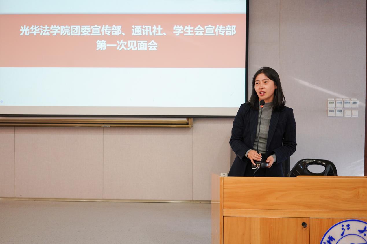 紧接着,骆笑老师对各位参会同学,尤其是从紫金港校区来到之江的新成员表达了感谢之情。骆笑老师认为参与宣传工作,可以让同学们在学习法学知识之余拥有一个新的技能,会对未来的学习生活产生非常积极的影响。同时,骆笑老师也强调了宣传工作中非常重要的政治敏锐度和责任心。希望同学们在接下来的工作中可以积极参与,共同成长。