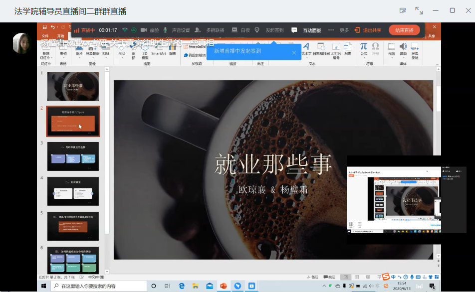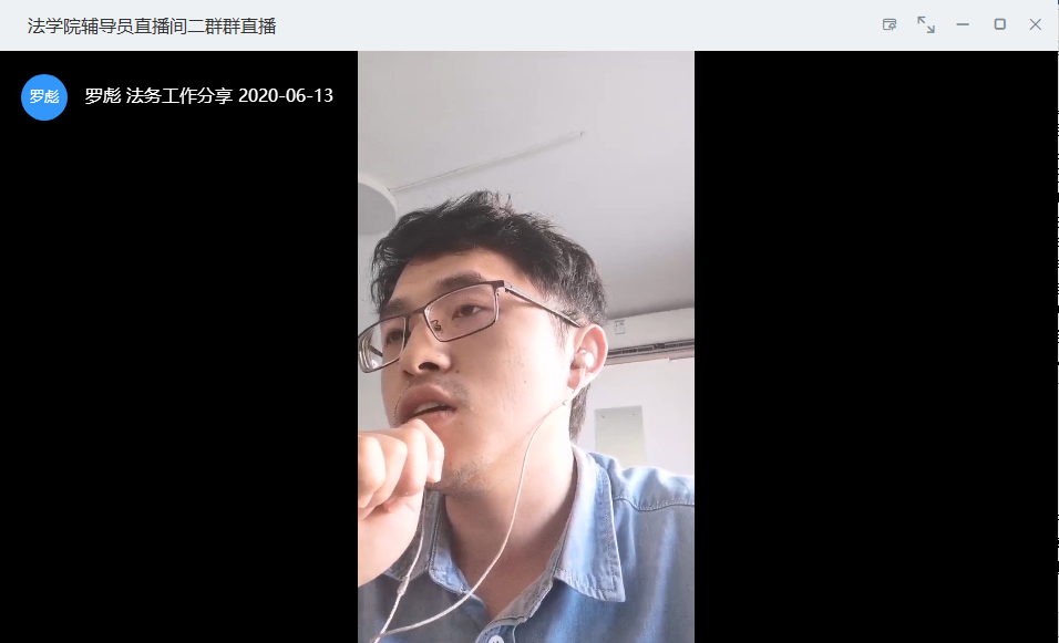 2020年6月13日,辅导员直播间云端平台再次启动,本期的主题是法学生的学业、职业规划及就业建议,旨在为法学院学生学业与就业提供建议与指导。本期辅导员直播间请到四位主讲嘉宾,分别是浙江六和律师事务所高级合伙人、一级律师、金融分析师柴善明,浙江中拓融资租赁有限公司法务专员罗彪,万商天勤(深圳)律师事务所律师助理欧琼襄,北京天元(杭州)律师事务所律师助理杨璧霜。