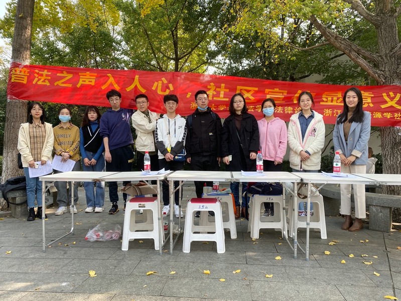 2020年11月8日,由浙江大学光华法学院法律诊所、浙江大学清源学社联合指导的“普法之声入人心,社区宣传显意义”2020秋冬学期第一次“送法进社区”活动在杭州市八卦田遗址公园开展。本次活动在胡铭老师、吴勇敏老师、陈信勇老师、章剑生老师、高艳东老师、许建宇老师、陆青老师等的指导下,与玉皇山社区居委会进行合作,以发放法律知识宣传单、现场法律咨询等形式,积极服务群众,在《民法典》颁布的重要年度为全民普法活动贡献力量。