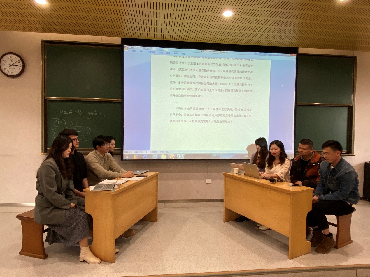 下午,经过理论讲解后,尤挺辉律师将同学分成五组,通过抽签的方式选取案例题目进行模拟法律谈判,并由同学们现场投票决定胜负,最终决出优胜组。