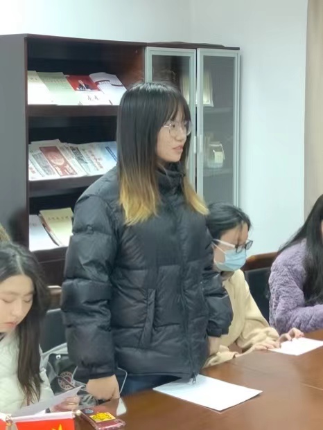 第一项议程,支部研究了预备党员胡琪宣同志的转正仪式。胡琪宣同志首先宣读了转正申请书,支部党员代表宋芷薇、方萍、徐白雪三位同志分别根据胡琪宣同志这一年预备期以及一贯的表现发表了意见和建议,一致认为胡琪宣同志达到了党员标准。随后,支部到会正式党员全票通过胡琪宣同志的转正申请。陈旭书记宣读了转正决定并对胡琪宣同志进行了勉励,希望她不忘初心、牢记使命,始终以党员标准严格要求自己,时刻与党中央党组织保持一致。也号召支部新老党员向胡琪宣同志在过去一年里优秀表现学习,强调支部党员互相批评学习不分新老,一概向先进看齐。