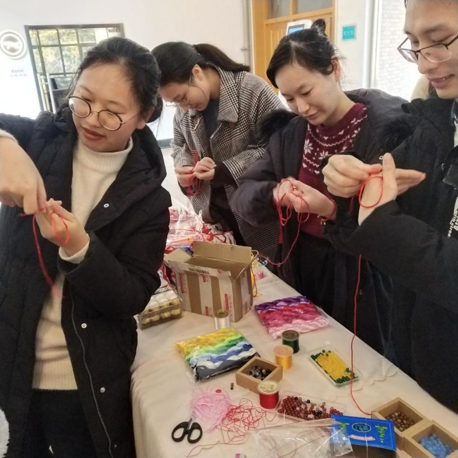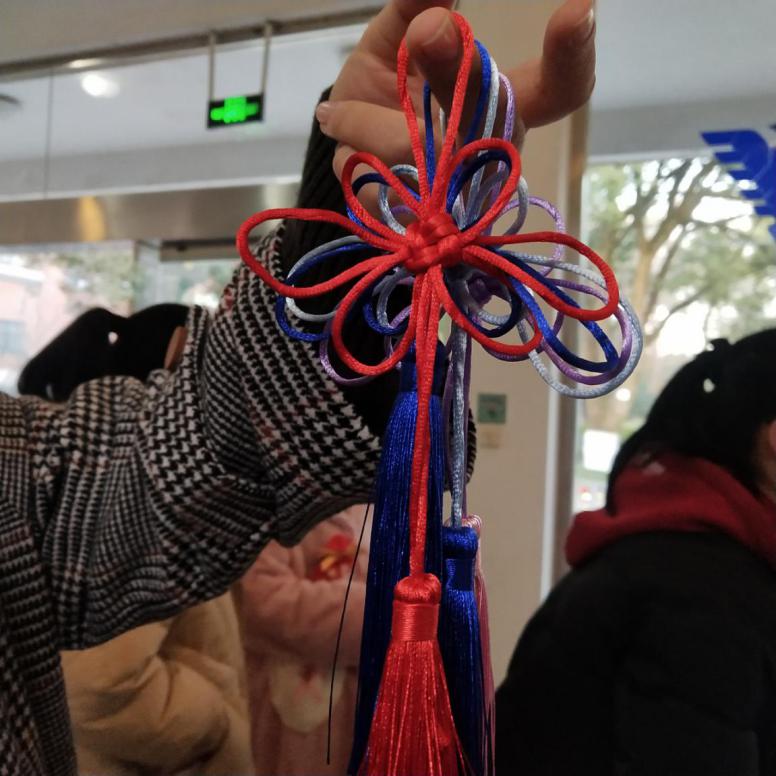 工作人员还为同学们准备了手工材料,并现场教学中国结和桔梗判的制作,不少同学主动尝试,在工作人员的指导下亲自将满满的祝福编织进小小的中国结里。