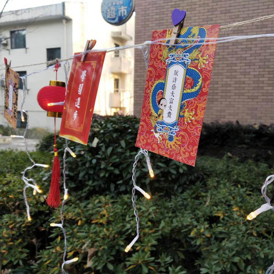 在许下新年愿望环节,工作人员为同学们准备了多种不同的新年贺卡,同学们纷纷在贺卡上写下对来年的期盼,并亲手将载满新年祝福的卡片挂在串满灯笼的绳子上,彩灯亮起,一个又一个真诚的祝福在风中闪耀,寓意愿望成真。