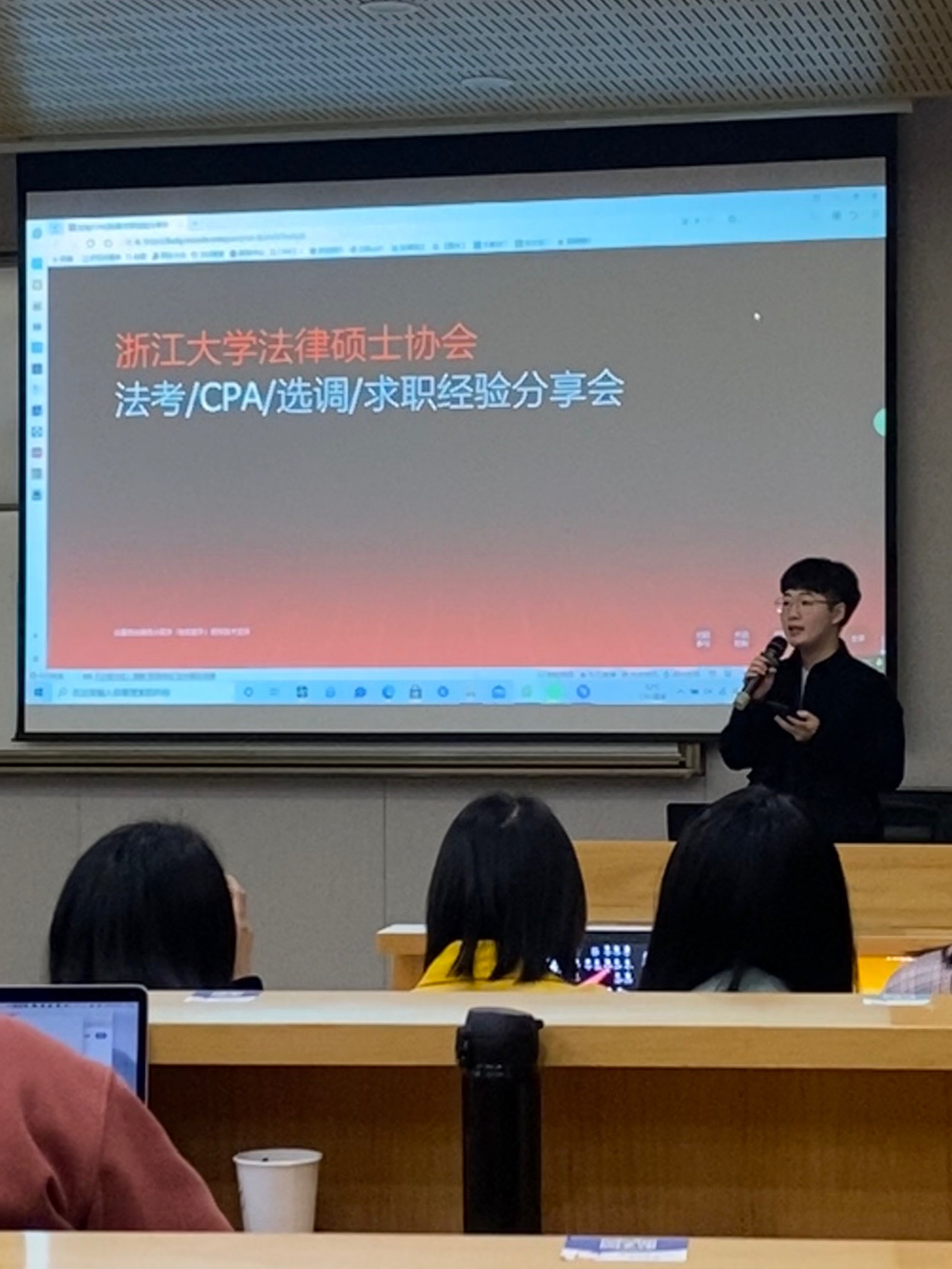 3月30日晚,2021年法律职业资格考试/CPA考试/选调/求职经验交流会在曾宪梓楼204顺利举行,本次交流会邀请到了众合教育杭州分校校长薛超老师、在20年法考中取得了351分好成绩的边品三同学、一年通关CPA六门的徐圆缘同学为大家分享经验,也邀请到了在选调中斩获佳绩的丁俊雄同学以及在求职颇有心得的白睿博同学为大家指点迷津。