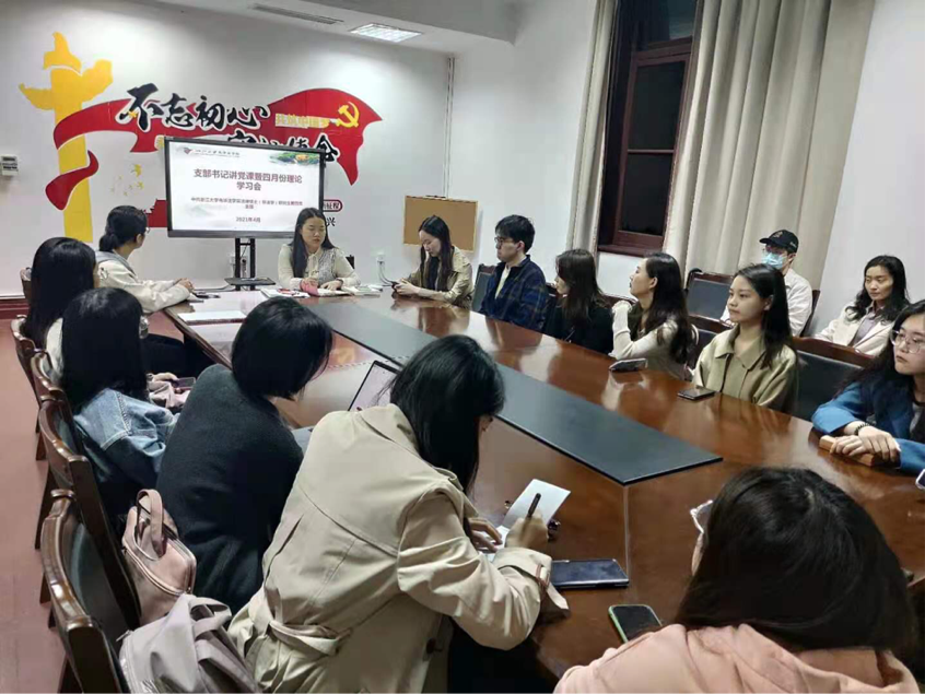 2021年4月24日,浙江大学光华法学院法律硕士(非法学)研究生第四党支部在外文馆党员之家召开了支部书记讲党课活动暨四月份党史理论学习会。会议由支部书记孟令晨旸主持,支部的正式党员、预备党员积极参与,发展对象、积极分子主动列席参加。本次支部书记讲党课的主题是“风雨苍黄百年路,高歌奋进新征程 ——从党史学习教育中汲取力量”。
