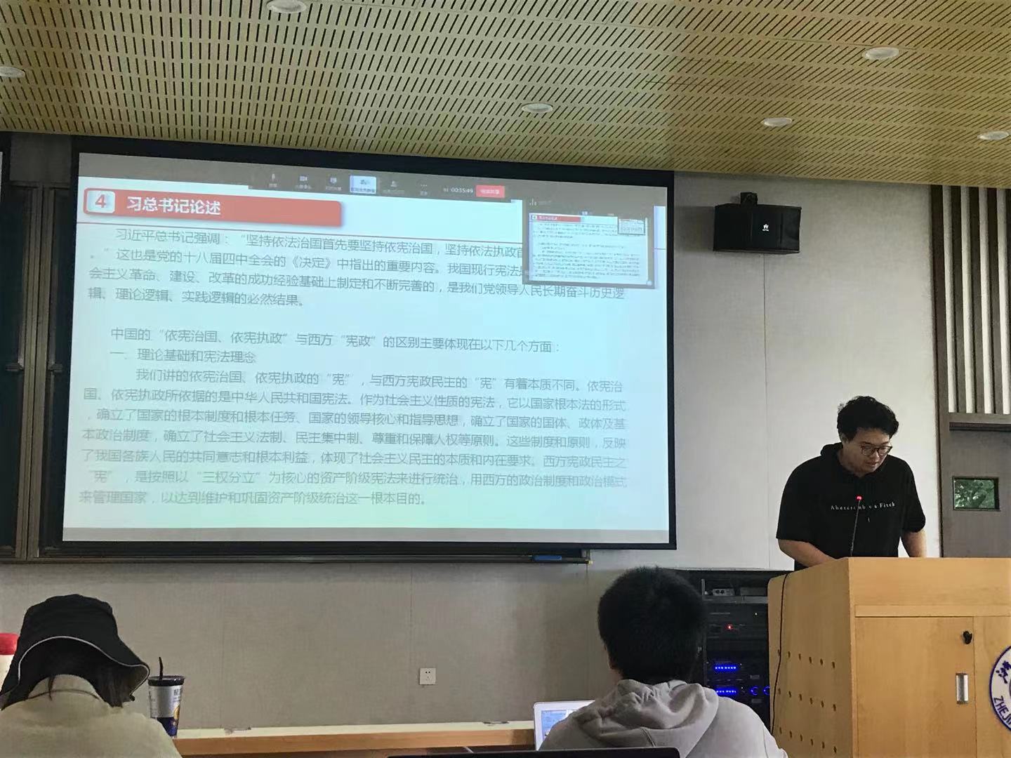 会议的第二环节,是介绍习近平法治思想重要精神的主题党日活动。由本三支部的云佳伦、毛国安同学进行展示,展示中重点说明了如何理解全面依法治国是国家治理的一场深刻革命、如何理解中国特色社会主义法治道路的正确性、如何理解公正司法的重要性、为什么我国的依法治国不同于西方宪政、为什么“党大还是法大”是伪命题这几个问题。使我们对习近平法治思想有了更多的了解。