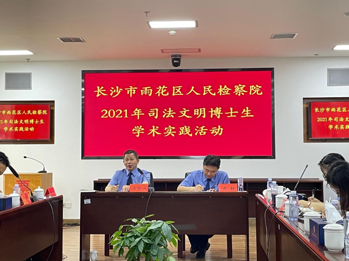 6月3日,本次学术交流的学子们来到了湖南省长沙市雨花区人民检察院,中南大学法学院副院长彭中礼教授,中南大学学科办主任、张新平副教授等人一同出席座谈会。会议由党组成员、副检察长周新主持,长沙市雨花区人民检察院党组书记、检察长马贤兴致辞。会议分为三个部分。首先,观看雨花区检察院院情介绍短片,雨花区检察院唐迅、肖小晶、罗大钧、刘乐等业务部门负责人,分别就司法改革、四大检察以及各自负责的工作进行了介绍;随后,与会双方围绕认罪认罚案件的律师辩护、公益诉讼与检察业务拓展、行政检察、检察建议的刚性等问题进行学术交流;最后,马贤兴检察长就实践中的捕诉一体、企业刑事合规、虚假诉讼等情况做了更详细的报告。