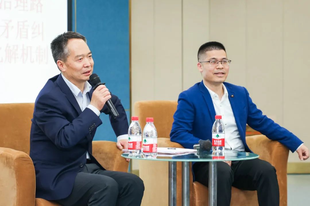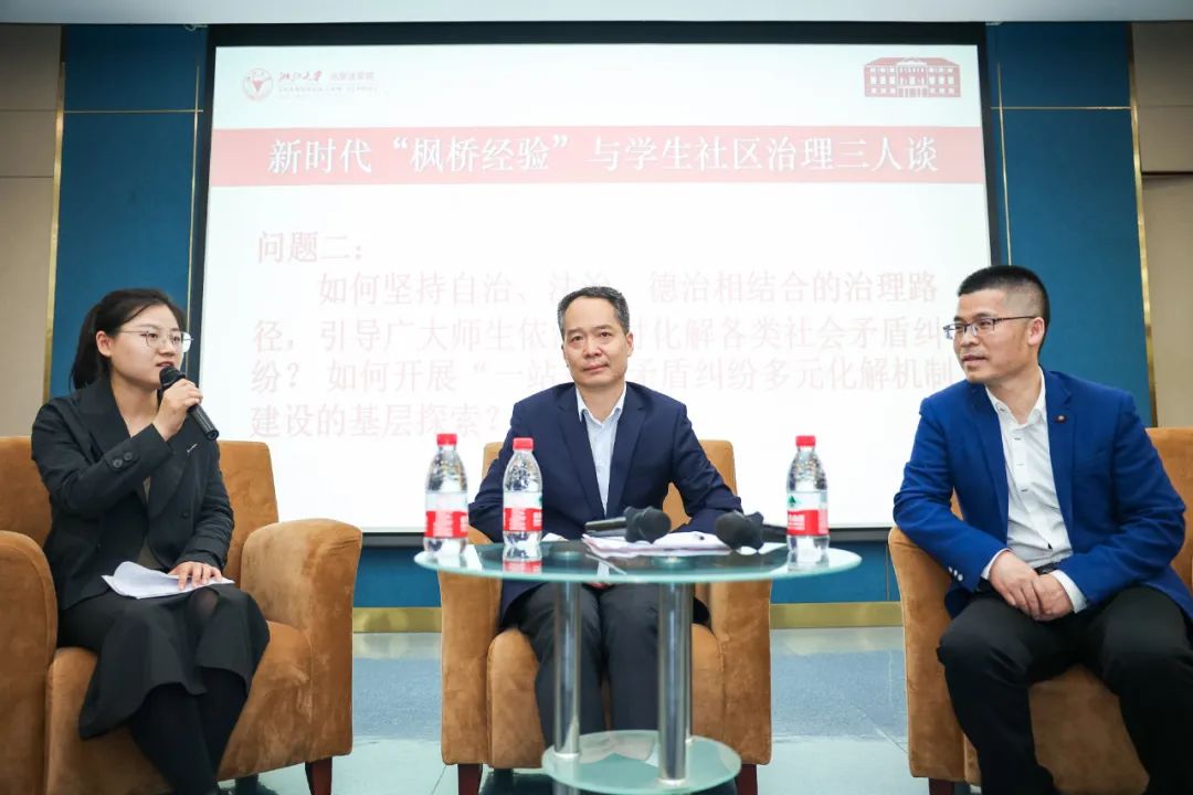 开幕式的第二阶段“新时代枫桥经验与学生社区治理”三人谈由两位在新时代枫桥经验研究领域极有建树的专家学者参与对谈,分别是浙江大学新时代枫桥经验研究院执行院长汪世荣,浙江大学新时代枫桥经验研究院常务副院长钭晓东。谈话由光华法学院2022级博士研究生、工作室志愿者林昕洁主持。