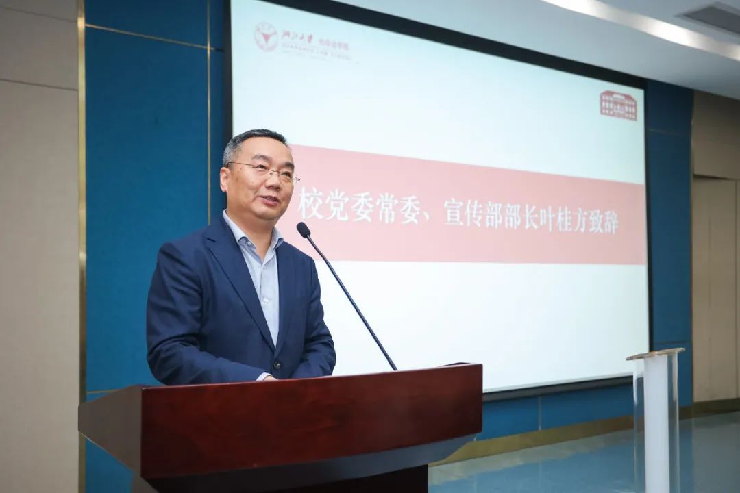 党委常委、宣传部部长叶桂方致辞并宣布第二十二届法文化月正式开幕。叶桂方老师指出,2023年是贯彻落实党的二十大精神的开局之年,党的二十大多次提及依法治国,体现了党中央对推进法治中国建设的高度重视。在全校上下深入开展学习贯彻习近平新时代中国特色社会主义思想主题教育之际,要深入学习领会习近平法治思想,加强法治文化宣传教育,提升全民法治意识。法文化月是我校历史悠久、特色鲜明、影响广泛的普法教育品牌,也是推动法治理念辐射社会、引领未来的生动实践。近年来我校法学学科主动服务国家重大战略,构建中国法学的自主知识体系,努力培养德法兼修的卓越法治人才,在第五轮学科评估中也取得了新的突破,这为推动法文化月高质量内涵发展提供了重要支撑。今年法文化月在延续以往传统优势基础上,打造新时代“枫桥经验”工作室,期待广大师生和各界法律工作者积极参与到本届法文化月的活动中来,参与到“枫桥经验”工作室的建设中来,持续提升干部师生法治素养,发挥法治文化熏陶教育作用,切实为师生为社会办实事办好事,大力推进依法治校,以昂扬的精神面貌,迎接学校第十五次党代会胜利召开,助推建设中国特色世界一流大学。