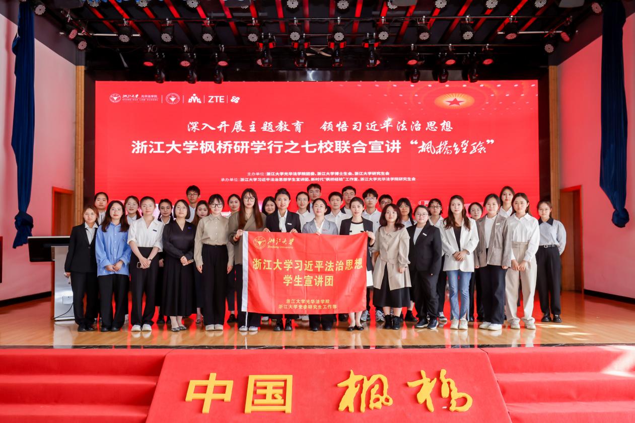 型的“枫桥经验”基层治理社区的途径,了解了“枫桥经验在”基层治理中的应用成果。下午,主题为“传承枫桥经验,点亮善治枫景”的七校联合宣讲活动在枫源村举行。浙江大学党委研工部副部长张晓洁、浙江大学团委副书记(兼职)孙正、光华法学院党委副书记、纪委书记李冬雪、光华法学院学工办主任、团委书记骆笑出席活动,研学团同学们现场参与了宣讲活动,来自七大高校的部分师生线上参与活动。活动由光华法学院兼职辅导员、博士生会主席团成员赵艺林主持