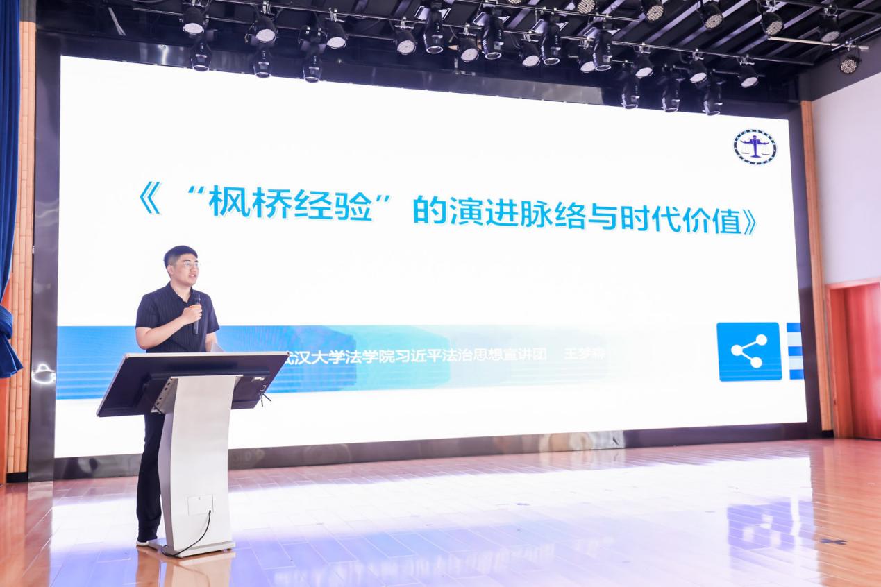 武汉大学法学院习近平法治思想宣讲团讲师王梦森作《“枫桥经验”的演进脉络与时代价值》主题宣讲。他围绕“枫桥经验”的形成与发展、“枫桥经验”的核心内涵、“枫桥经验”的时代价值三方面内容进行讲解。他指出,枫桥经验”丰富和发展了中国特色社会治理理论、为基层治理现代化提供了中国方案,并且为推进法治社会建设提供了内生动力。