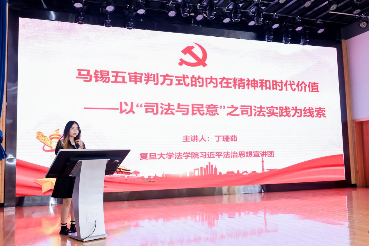 复旦大学法学院习近平法治思想宣讲团讲师丁珊茹作《马锡五审判方式的内在精神和时代价值——以“司法与民意”之司法实践为线索》主题宣讲。她讲解了马锡五审判方式的概述和法治意涵,她指出,司法工作的不平衡不充分发展,已经成为满足人民群众日益增长的司法需求的主要制约因素。并从七个“既要”和“又要”切入,讲解了新时代人民法院工作实现高质量发展的重要精神财富。