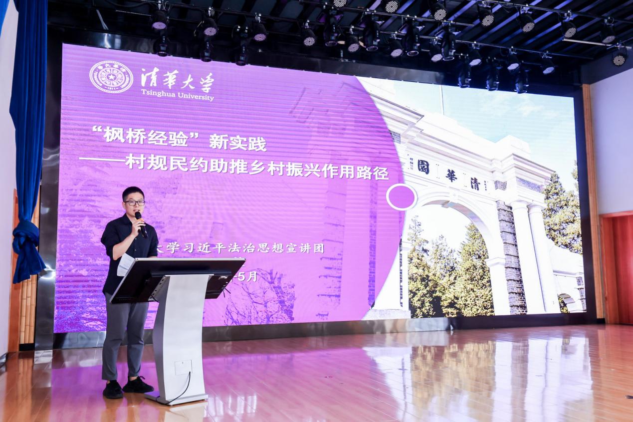 清华大学法学院习近平法治思想学生宣讲团讲师王牧作《枫桥经验”新实践——村规民约助推乡村振兴作用路径》主题宣讲。他表示,“枫桥经验”蕴含了重视村规民约的乡村基层社会多元治理逻辑,进而分析了乡村振兴新阶段对村规民约的现实需求,并与大家分享了村规民约助推乡村振兴的部分完善进路。他认为,包含了村民对生产生活秩序的共同追求和价值认同的村规民约,可以充分发挥民主自治的强大力量,不断满足人民群众对更美好生活的需求,是乡村不断增强自我发展能力,使乡村振兴能够行稳致远的保障之一。