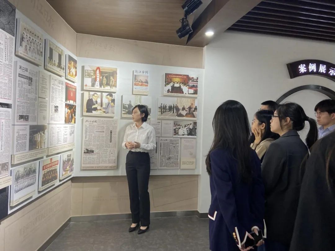 在工作人员的引导和讲解下,同学们走进浙江省高级人民法院院史馆,深入了解省高院的历史沿革、文化建设和审判工作。1950年3月28日,浙江省人民政府发布通令,组建浙江省人民法院。在这60余年的流金岁月里,省高院各项建设取得了全面发展。审判领域不断拓宽,刑事、民事、海事、海商、行政、执行各类案件大量增加。先进集体和个人不断涌现,1993年至2013年,全省法院218个集体、207名个人被评为全国先进;基层基础不断夯实,1572个审判法庭全部数字化。工作人员为同学们讲解法院制式服装的演进、往年重大案件的处理、世界互联网法治论坛的国际私法交流活动等板块,同学们零距离感受法院文化和司法正义。