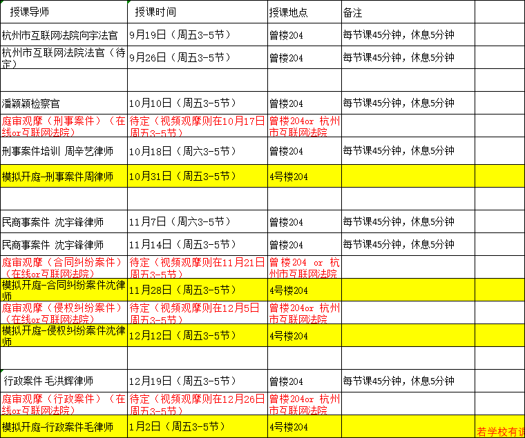 因案件观摩时间可能会有调整,后续模拟开庭时间会相应调整;根据学校调课安排,后续时间可能会有变动。 |