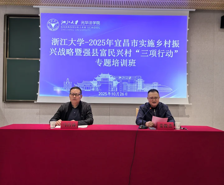 10月26日上午,浙江大学——浙江大学-2025年宜昌市实施乡村振兴战略暨强县富民兴村“三项行动”专题培训班顺利开班。宜昌市农业农村局党组成员、副局长马昌沛和浙江大学光华法学院继教中心发展委员会主任姜俊杰出席开班式。