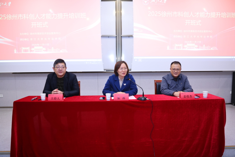 11月17日上午,浙江大学——2025徐州市科创人才能力提升培训班顺利开班。徐州市科技局副局长张燕和浙江大学光华法学院继教中心发展委员会主任姜俊杰出席开班式。