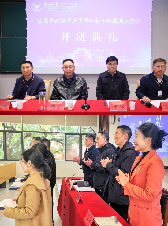 11月17日,山西省政法系统优秀年轻干部培训示范班开班典礼在浙江大学光华法学院顺利开班。山西省委政法委委员、政治部主任杨霄、山西省委政法委二级巡视员刘超和浙江大学光华法学院院长胡铭共同出席了开班典礼。