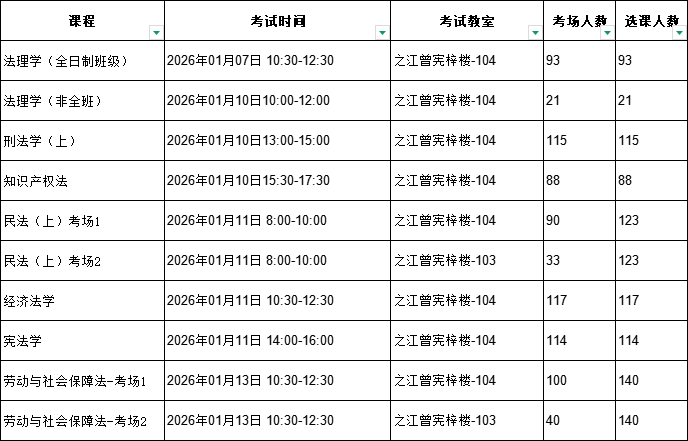 各位同学:以下是2025-2026学年冬学期光华法学院研究生课程考试安排,其中《民法(上)》和《劳动与社会保障法》课程因选课人数较多分在了2个考场,请大家务必在研究生教育管理信息系统中确认自己所在的考场。