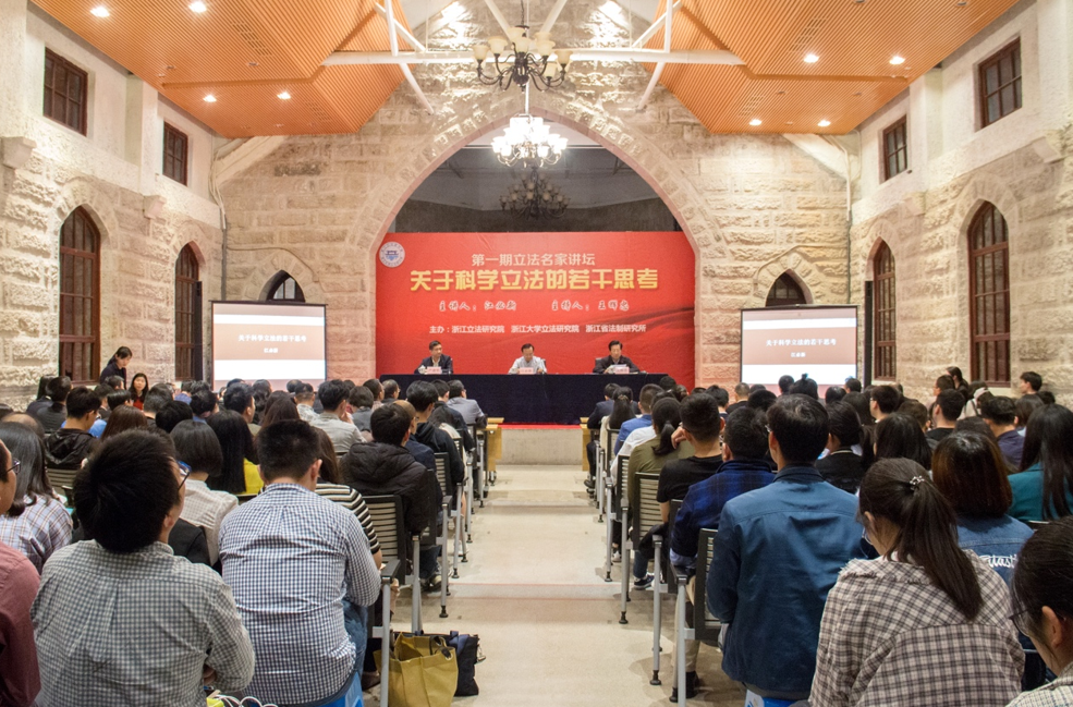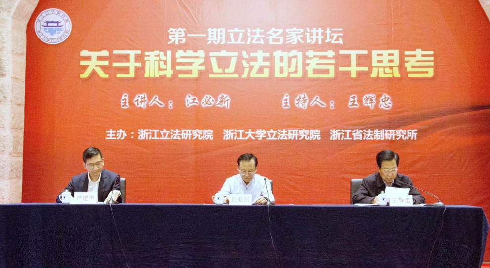 2018年4月19日晚,浙江立法研究院暨浙江大学立法研究院首期“立法名家讲坛”在浙江大学之江校区小礼堂顺利举行。“立法名家讲坛”是立法研究院的重要活动之一,旨在邀请立法领域最权威的实务与理论专家传经送宝,推动立法理论与实践的转型升级。首期“立法名家讲坛”主讲人为中国法学会副会长、中国法学会行为法学会会长江必新教授,主题为“关于科学立法的若干思考”。全国人大华侨委员会委员、省十二届人大常委会党组书记、副主任王辉忠主持本次讲坛。浙江大学副校长严建华致辞。最高人民法院行政审判庭、浙江省人民代表大会常务委员会法委、法工委、浙江省高级人民法院有关领导,浙江大学光华法学院常务副院长周江洪以及省属各高校法学院的师生代表,齐聚礼堂、共飨知识盛宴。