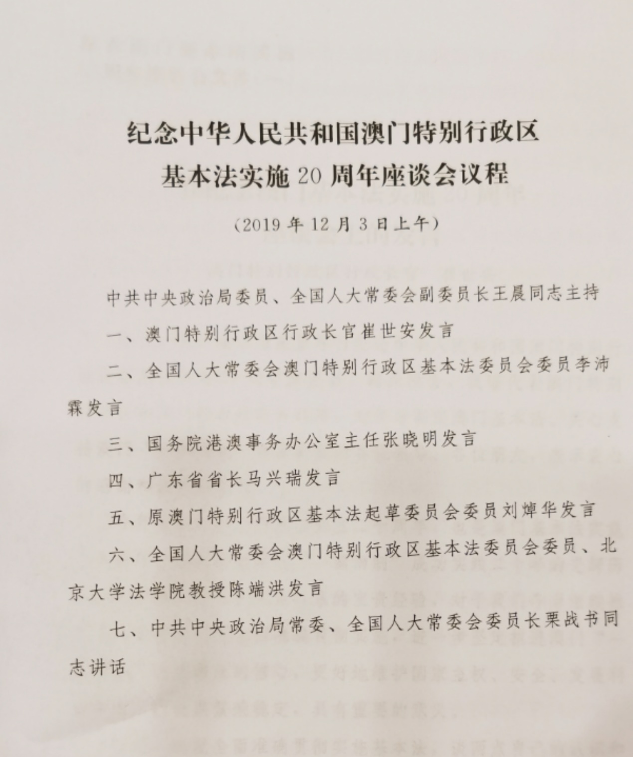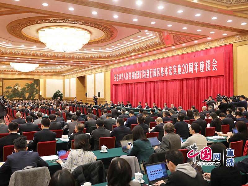 12月3日上午,为庆祝澳门回归祖国20周年,全国人大常委会办公厅在人民大会堂一楼东大厅举行纪念中华人民共和国澳门特别行政区基本法实施20周年座谈会。中共中央政治局常委、全国人大常委会委员长栗战书、中共中央政治局常委、国务院副总理韩正、中共中央政治局委员、全国人大常委会副委员长王晨等党和国家领导人、中央有关部门负责人、澳门特别行政区行政长官及部分主要官员、广东省人民政府负责人、澳门基本法委员会成员、从事基本法研究的专家学者出席座谈会。栗战书在会上发表讲话强调,要深入学习贯彻习近平总书记关于港澳工作的重要论述精神,坚持和完善“一国两制”制度体系,在宪法和澳门基本法的轨道上推进具有澳门特色的“一国两制”成功实践。3日下午,在人民大会堂一楼安徽厅举行了纪念中华人民共和国澳门特别行政区基本法实施20周年研讨会。