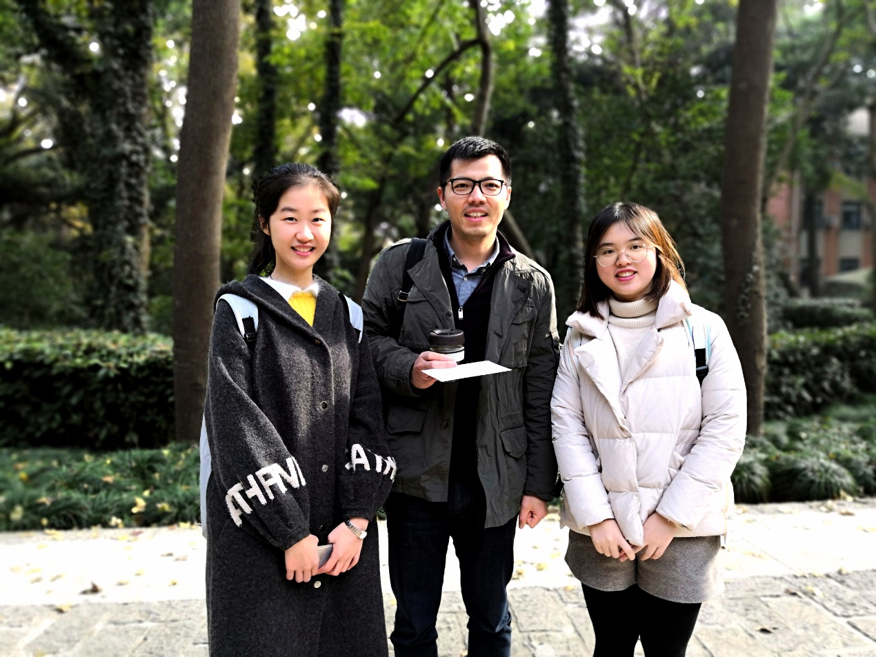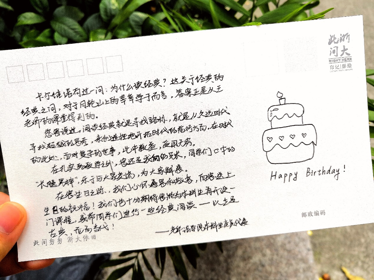 卡尔维诺有过一问:为什么读经典?这关于经典的经典之问,对于月轮山上的莘莘学子而言,答案正是由王老师的课堂给出的。您曾说过,阅读经典就是寻找路标,就是从久远时代寻找超越的思考,来创造性地开拓时代的前行方向。在时代的此处,面对复杂的世事,此中教益,受用无穷。在扎实的教学之外,您还是我们的兄长,同学们口中的“长腿男神”,乐于与大家交流,为大家解惑。在您生日之际,我们心怀感恩和敬意,向您送上生日的祝福!我们也十分期待您能为本科生再开设一门有趣的课程,或者带领同学进行一些有益的经典阅读,以立足古典,面向当代!”本科生第四党支部黄味和王璇同学作为党员代表为王老师送上精心制作的贺卡。