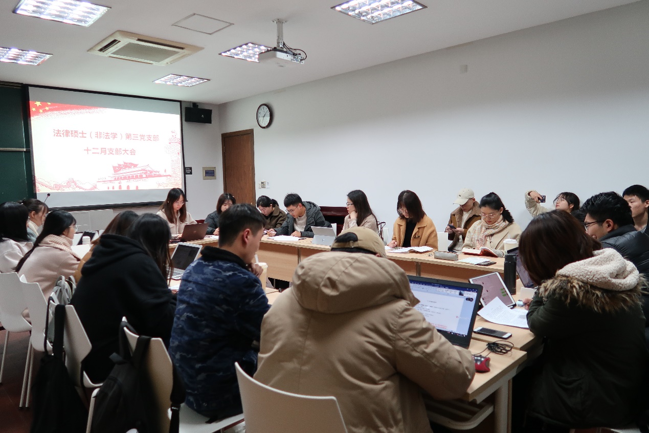2019年12月10日,根据中央《关于开展第二批“不忘初心、牢记使命”主体教育的指导意见》精神和学校学院相关文件指示,浙江大学光华法学院法律硕士(非法学)研究生第三党支部于7号楼103召开了十二月支部大会,会议内容包括党员转正、“不忘初心、牢记使命”主题教育党支部专题组织生活会暨民主评议会 。