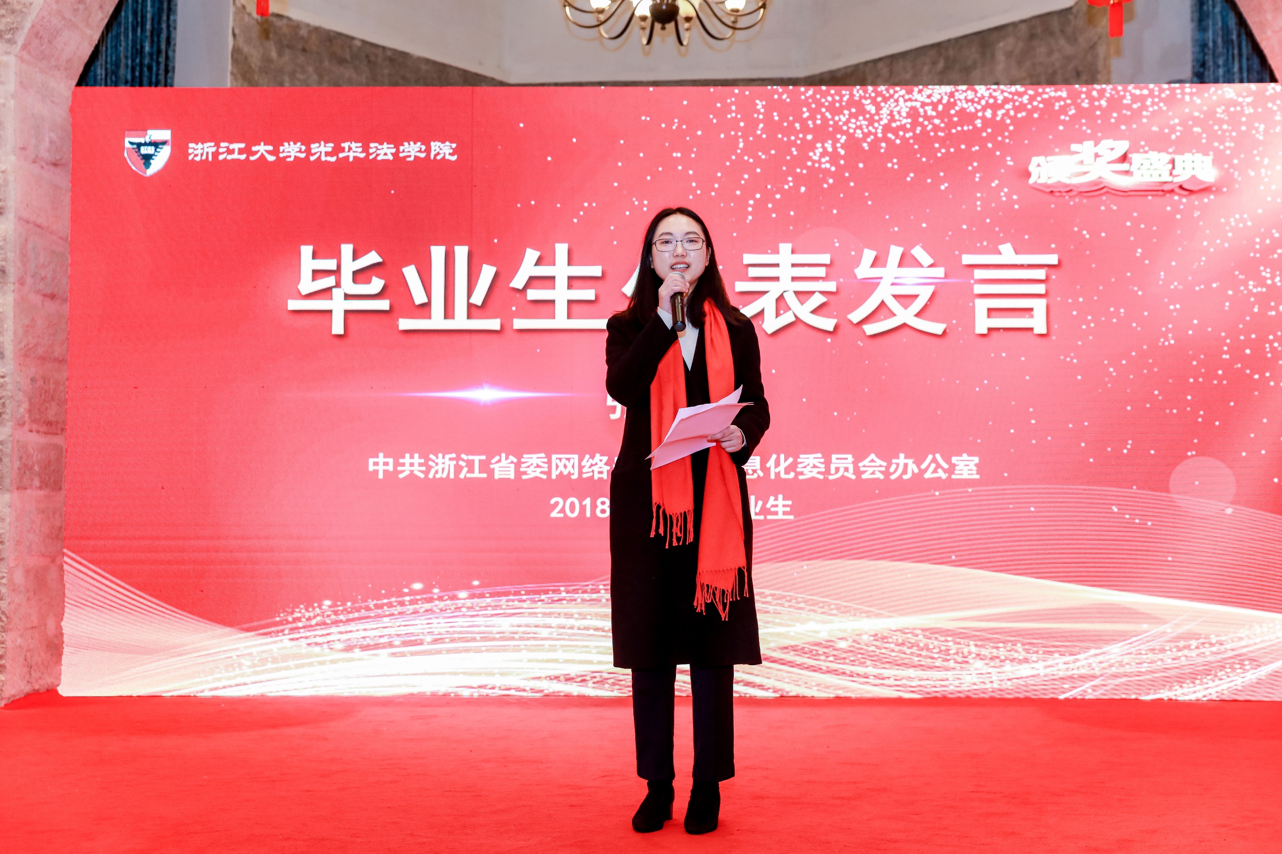 颁奖典礼初始,现任职于中共浙江省网络安全和信息化委员会办公室的我院2016届法学本科、2018届法学法硕毕业生张依雨校友发言,她表示非常感谢泽大律师事务所和学院组织“吾爱吾师奖”评选活动,让像她这样的毕业生们能够借此机会回忆在学校的日子,对老师们说说心里话。在这次“吾爱吾师奖”评选过程中看到很多同学很认真地为老师推荐和写评语,参与其中深受感动,顿时在求学过程中所有老师的形象在脑海里又重新浮现。“高山仰止,每位老师身上都有渊博学识和我敬重的品格,我们的老师不仅是领我们入法学之门的师傅,是我们学习路上的引路人,也是我们的人生导师。在这里,我想借用一句老话表达我对老师们的敬意和感谢,我不是你们最优秀的学生,但你们都是我最敬重的老师。”