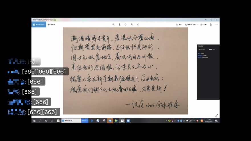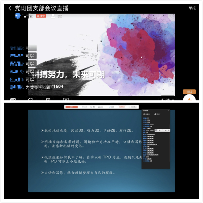 一个支部、三个年级、五位老师、六十多位同学同时在线,这是第一次网上直播的新形式班会,第一次党支部和团支部共同参与的联合式班会,第一次师生交流与朋辈交流相结合的融合式班会。虽天寒地冻,疫情严峻;但心底的希冀与温情却足以支持我们擂起战鼓,蹄踏沙场。让我们一起守候庚子年的东风,看她再次吹绿这片生机暗涌的大地。马上,我们山上见!
