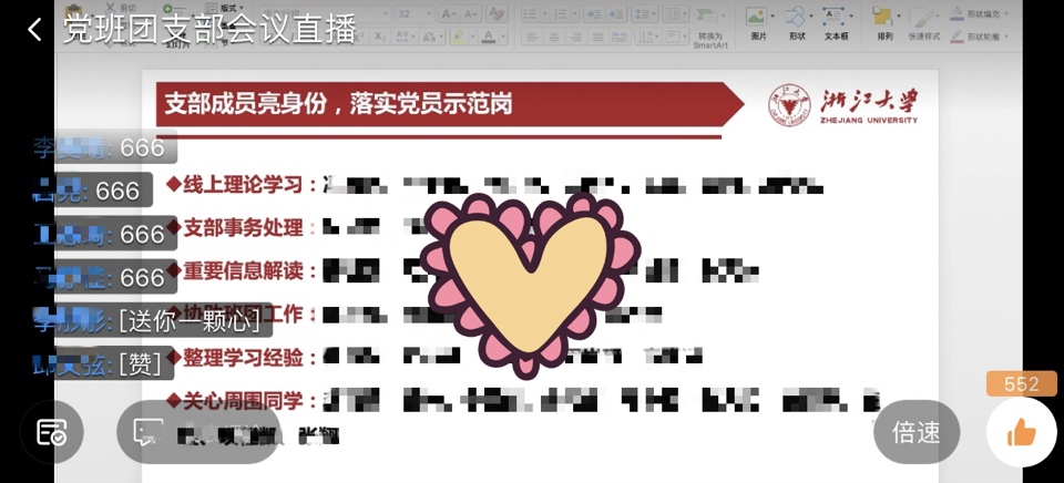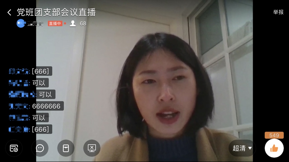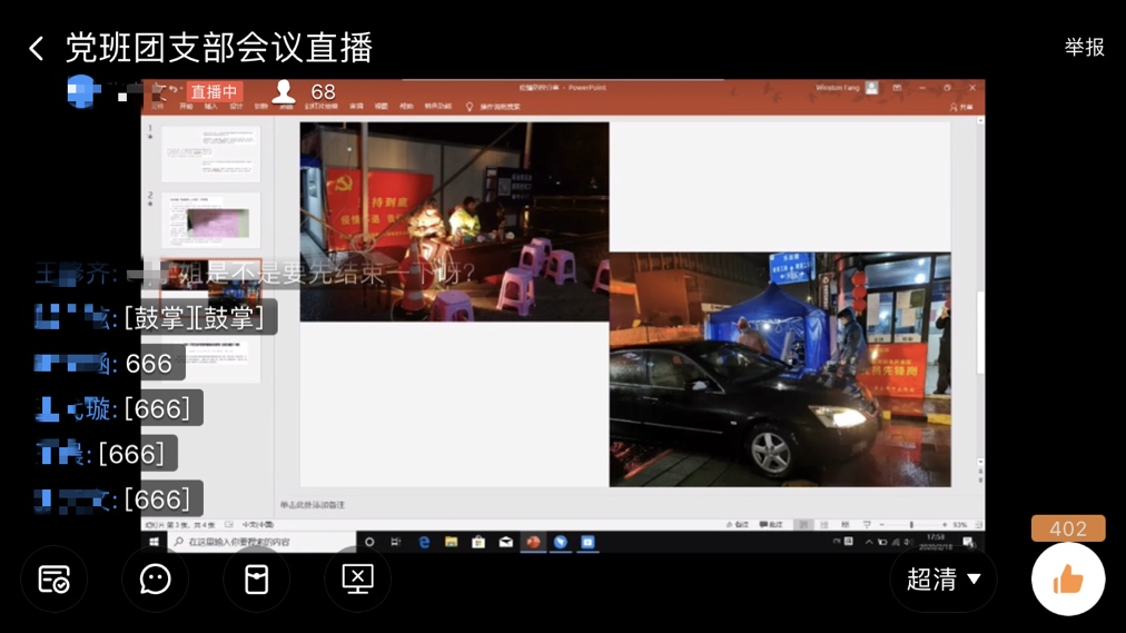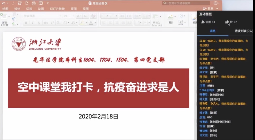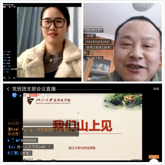 为了更好地落实网上教学、加强疫情防控、深化管理教育,2月18日下午4点,浙江大学光华法学院本科生第四党支部联合1604、1704、1804班团以线上直播的形式举行了以“空中课堂我打卡,抗疫奋进求是人”为主题的党班团支部会议。虽然当前处于疫情非常时期,大家四散于五湖四海,但同学们不减热情积极参与会议,用文字与声音交流意见,以点赞与互动抒显真诚。团委副书记辅导员骆笑老师、本四党支部结对老师许建宇老师、1604班班主任洪佳颖老师、1704班班主任林洹民老师、1804班班主任邱文弦老师也参与了本次会议,会议由党支部书记张竞文同学主持。