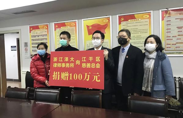2月11日,泽大所向浙江省杭州市江干区慈善总会定向捐赠“抗击新冠肺炎”款100万元。这100万捐款将通过江干区慈善总会定向捐赠予杭州市西溪医院50万,浙江大学医学院附属第一医院之江院区50万,并用于奖励帮助该院抗击新型冠状病毒肺炎,在一线承担直接救治任务、直接接触新型冠状病毒肺炎患者的医生及护士。