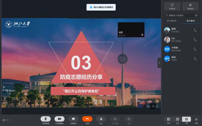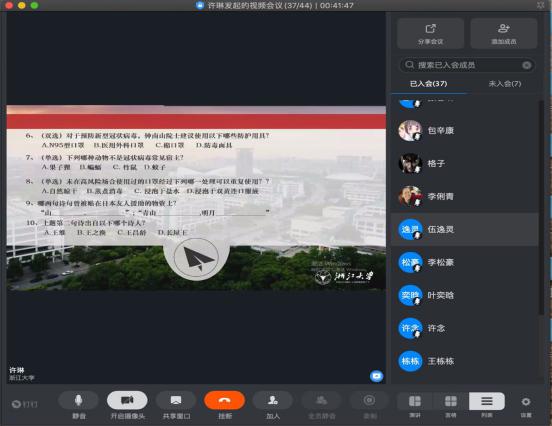 此后,我们来到了会议第四部分:抗疫志愿服务经历分享。卢彦洁同学分享了自己的防疫经历,讲述了自己在在做志愿者的过程中的所见所闻、遇到的困难和取得的收获,并发表了自己的感想,展现出了浙大学生的社会责任感与担当,坚定了所有同学的信心。风雨面前,我们不止躲在英雄身后。我们会尽己所能,和他们并肩战斗——众志成城,战“疫”必胜!最后,会议在“疫情周边小抢答”的轻松氛围中结束。
