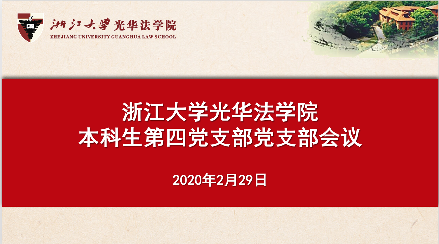 2020年2月29日,为积极响应光华法学院党总支号召,光华法学院本科生第四党支部围绕“疫情防控,党员当先”,以浙大钉视频会议形式,进行理论学习、微党课分享、话题研讨、承诺践诺、知识竞赛,通过云端组织生活会与支部全体成员携手战疫。