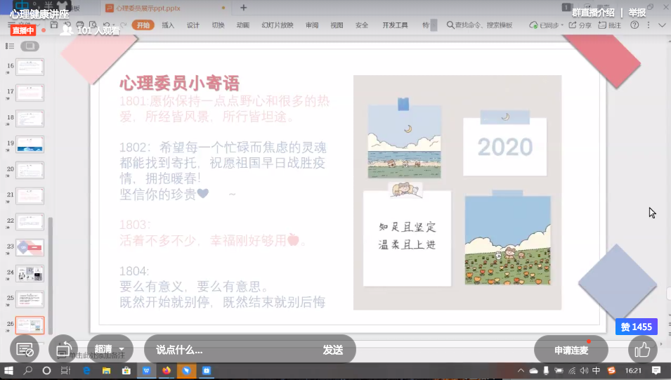 林子欣同学向同学们展示了抑郁症科普视频,希望大家在环境压力逐渐增大、抑郁症发病率逐渐提升的当下,更加了解抑郁症,更加理解抑郁症人群。各班心理委员也为同学们送上自己的温暖寄语,鼓励同学们在特殊时期,仍要保持身心健康、良好情绪。待到春暖花开,相信我们会重聚求是园。