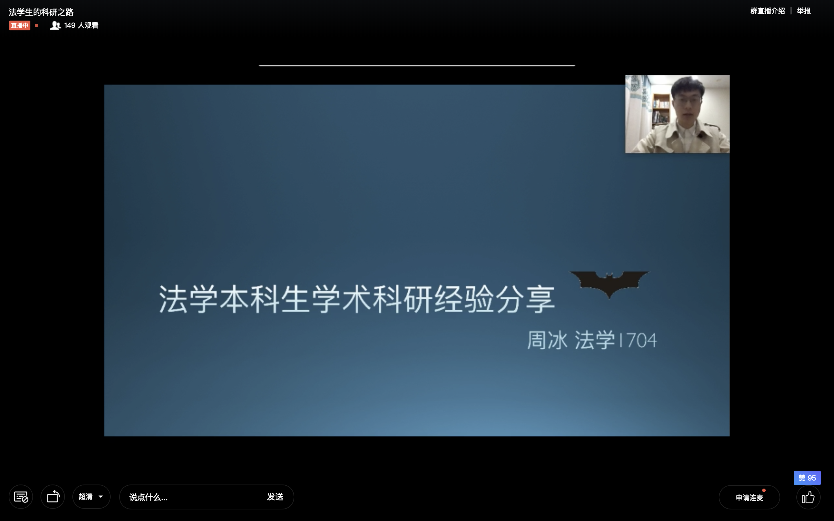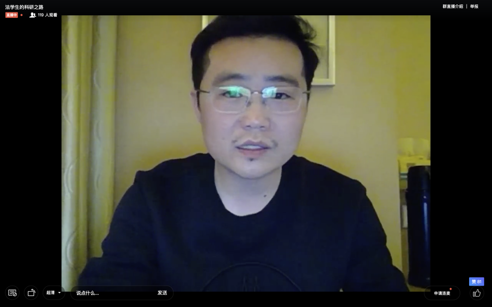 2020年3月21日晚上7点,浙江大学光华法学院辅导员直播间开启了主题为“法学生的科研之路”的直播。本次讲座中,光华法学院2017级法学理论专业的博士生郭栋与1704班本科生周冰带领我们走上科研之路,两位学霸都有丰富的学术科研经验,给我们带来了许多实用的技巧,让我们对法学学术有了更深刻的了解。本次直播共有170余名同学参与观看或互动。