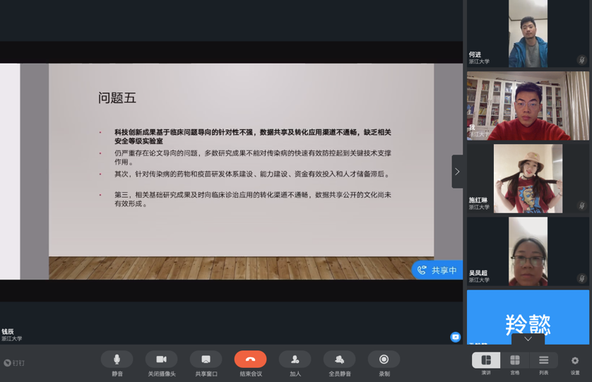 第一项,由钱辰同志作“疫情防控中的问题与对策”的党课分享。钱辰同志以本次疫情反映出的制度、社会问题出发,指出了作为党和人民事业的大敌,形式主义、官僚主义在此次疫情防控中再度展现出了惯性力量,同时,疫情也凸显出我国公共卫生和疾病防控体系建设与经济发展不相适应的问题,医疗供给和战略储备也不充足。对于以上问题的应对,钱辰同志提出了个人的思考,即应当全面深化改革和加强公共卫生和疾病防控体系,优化重大突发公共卫生事件应急机制,提高政府治理能力和公民知识的普及力度。支部成员对此也展开了积极的分析与思考。