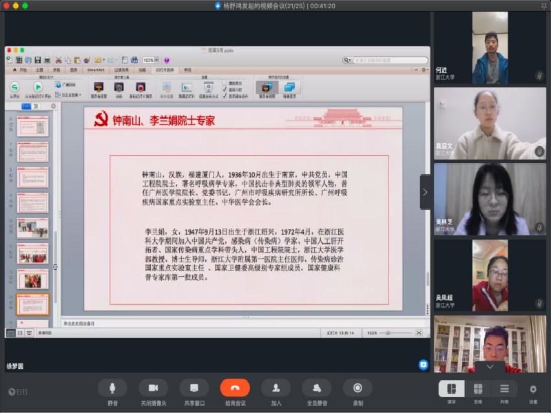 徐梦圆同志则以“让党旗在防控疫情斗争第一线高高飘扬”为主题进行了分享。党课的开篇,她指出,一个党员就是一面旗帜,一个支部就是一座堡垒。徐梦圆同志列举了疫情防控中自发请愿奔赴一线的医生、护士党员,社区民警、村委委员等身边的党员同志以及钟南山、李兰娟院士等优秀党员同志的鲜活事例,使同志们更加深刻的意识到只有党员首先站出来、敢于冲上去,把群众带动起来、凝聚起来、组织起来,才能紧紧依靠人民群众坚决打赢疫情防控阻击战。