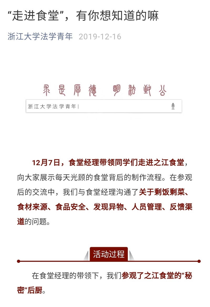 冬至的饺子、清明的青团、端午的粽子,虽然场地有限,但经理努力办好每一次活动,让师生热热闹闹地过节,感受节日的氛围。经理自豪地说,“别的校区有的,我们之江也一定有”。举办进食堂的活动,拉近同学和食堂师傅的距离,让同学们了解食堂的运作,经理说和同学熟悉以后,能够有更好的交流。