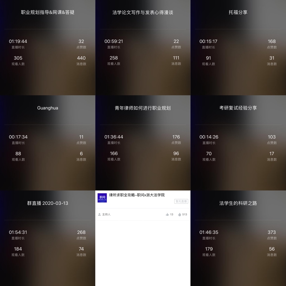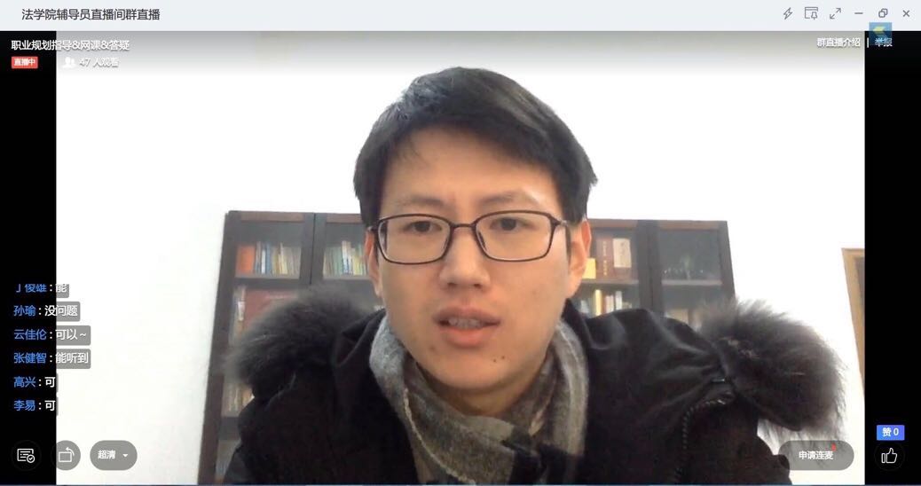 到目前为止,“辅导员直播间”已经进行了8期,主题分别为“疫情下的就业季” 、“漫谈法学论文写作与发表” 、“托福高分和留学申请经验分享” 、“青年律师如何进行职业规划” 、“考研复试指导” 、“打造你的‘高分’简历” 、“精品律所求职攻略” 和“带你走上法学生的科研之路”。经初步统计,各期直播累计在线观看人数已超过1500人次。