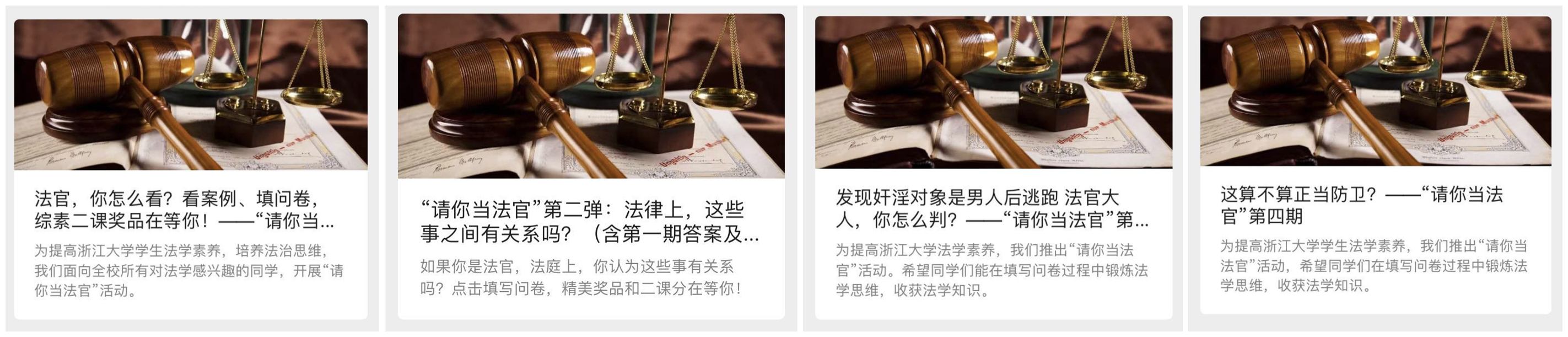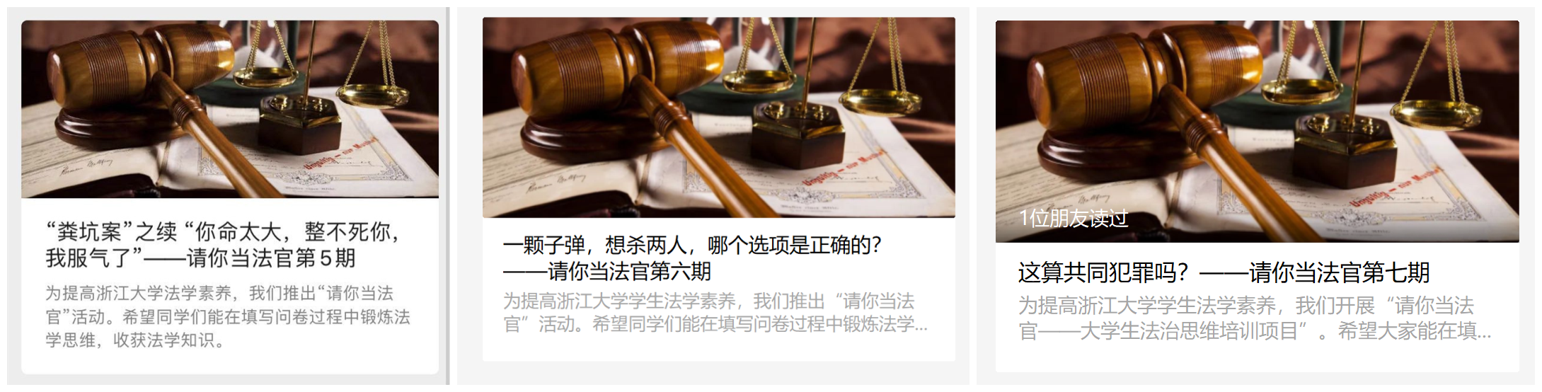 我们通过线上发布问卷的方式,让同学们站在法官的角度对案例形成自己的思考,进而了解法学知识、锻炼法治思维。以“浙法”微信公众号为平台,我们进行推文发布与推广宣传。