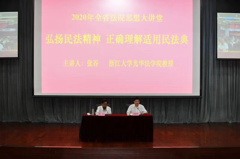 2020年6月9日,“全省法院思想大讲堂”活动在浙江省高级人民法院审判大厅举行,作为启动浙江省三级法院学习民法典的开端活动,张谷教授作了“弘扬民法精神 正确解释和适用民法典”为题的讲座。浙江省高院李占国院长,朱深远、徐建新、朱新力等副院长,以及全省11个中院、93个基层法院、240多个派出法庭,共1万1千7百多一线的员额法官,以线下线上相结合的方式观看了讲座。