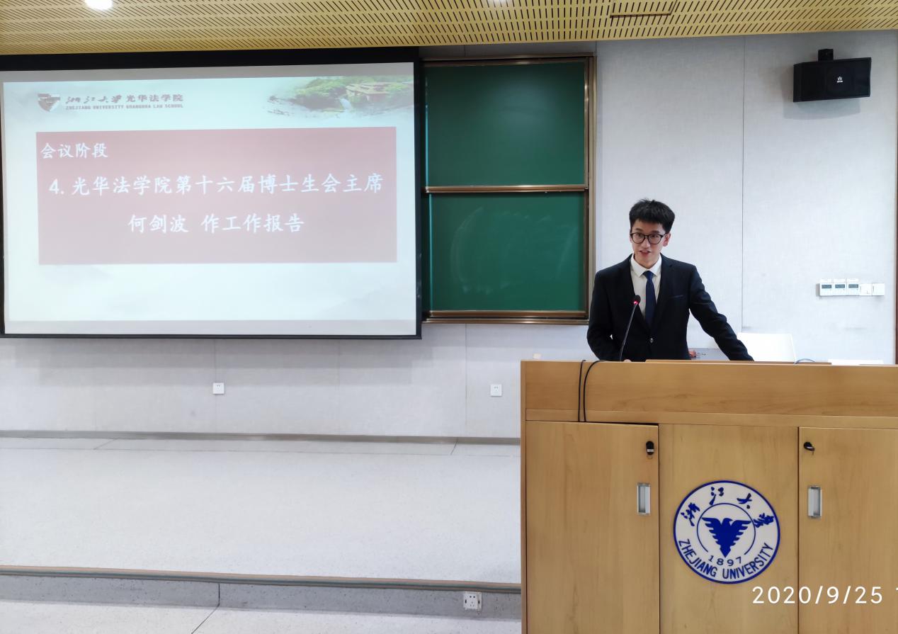 光华法学院第十六届博士生会主席何剑波对光华法学院第十六届博士生会过去一年的工作进行了主题为“坚定信念,引领风尚,凝聚力量,奋发有为,为争创世界一流会聚青年力量,在中华民族伟大复兴之路上闪耀青春光芒”的总结报告。从“积极参与校院各项事务,发挥桥梁纽带作用,传递博士生的声音”、“注重沟通,积极协调,解决博士生切身需求有成效”“加强合作交流,构建沟通共享多平台”等议题方面具体论述了一年来所取得的成果,并对接下来的工作提出了建议。工作建议包括“强化博会团队意识,寻求博会工作新机制;强化跨学科交流,打造品牌活动;以法之名,面向社会,学以致用”等。