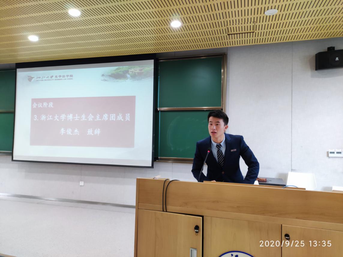 随后,浙江大学第十八届博士生会主席团成员李俊杰致辞,对光华法学院第十六届博士生会在学术交流活动、文体交流活动、对外交流、深化改革工作中取得的成绩表示认可,并预祝第十七次博士生代表大会取得圆满成功。